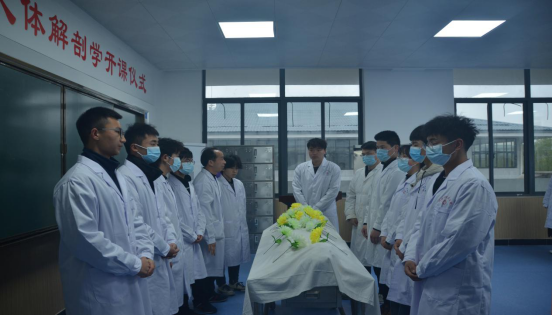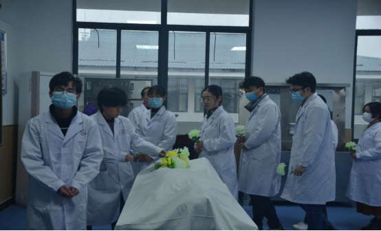 宣誓后,全体人员手执鲜花面向“大体老师”三鞠躬,深沉默哀一分钟,感恩其充满大爱的奉献精神。随后,大家怀着崇敬的心情,有序地向引领我们走向神圣医学殿堂的“大体老师”献上象征哀思与悼念的黄白菊花,向其表达崇高敬意。