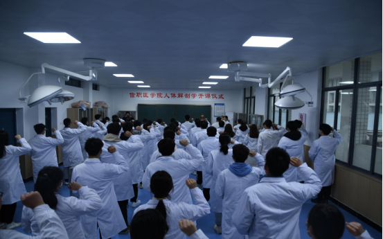 “无言良师,授吾医理;敬若先贤,临如活体;正心恭行,追深辨细;德彰术精,修成大医……”大家在陈清老师的带领下,面向“大体老师”肃立,举起右拳郑重宣读解剖学誓词,铿锵有力的解剖学誓词响彻在太阳成解剖实验室。