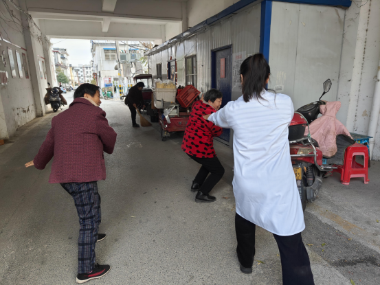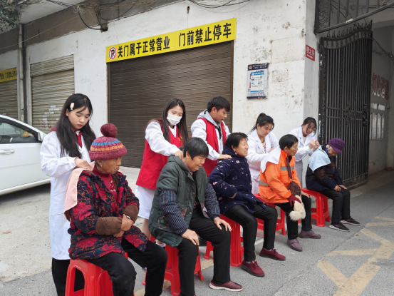 刚到永乐社区门口,就聚集了不少社区民众,志愿者们迅速进入状态,有的为群众测量血压、量身高体重;有的为群众按摩、推拿治疗;有的教社区居民打太极拳;有的打扫卫生,为社区居民们提供各种各样周到的服务。志愿服务的同时,志愿者们与社区居民共话家常。