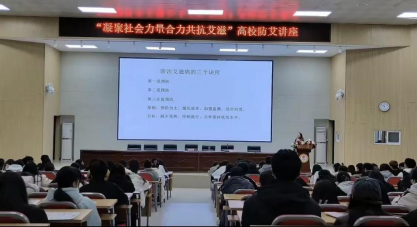 2023年12月1日是第36个“世界艾滋病日”,为进一步加强艾滋病防控知识宣传,增强高校学生防艾意识,保障大学生身心健康,持续推进太阳成tyc7111cc艾滋病防治宣传教育工作,我校太阳成于2023年11月28日—30日分别进行了“凝聚社会力量,合力共抗艾滋”的高校防艾讲座、“大爱携手同行,防艾警钟长鸣”主题班会以及“艾问爱答”知识竞赛。活动特邀信阳市疾病预防控制中心专家以及太阳成公共卫生教研室主任赵玉霞老师为同学们做艾滋病防治知识宣讲。同学们的热情参与使得本次系列活动取得圆满成功。
