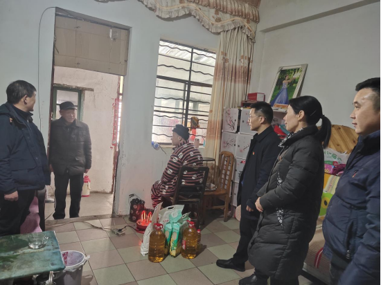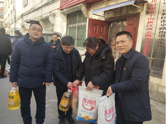 同志们在社区负责人的指引下来到社区困难群众家中。面对困难群众他们感情真挚、态度亲近,通过拉家常为困难群众提供精神上的温暖,帮助他们树立克服困难的信心。同时,他们还为困难群众送上了面、米、油等生活物资,以便困难群众能更好的度过这个寒冬。最后,他们还向困难群众们送上了新年祝福。