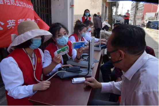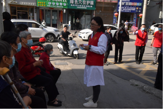 活动中,党员志愿者们身穿“红马甲”,携带血压计、听诊器、口罩、消杀喷壶等工具,充分发扬为群众排忧解难的奉献精神,头顶着炎炎烈日在小区大门口为社区群众进行义诊,主要是为中老年人测量血压和健康咨询、为儿童提供推拿服务、指导居民正确佩戴口罩和普及家庭消杀注意事项。大家分工明确,配合默契,用自己的实际行动诠释了共产党员的责任与担当。